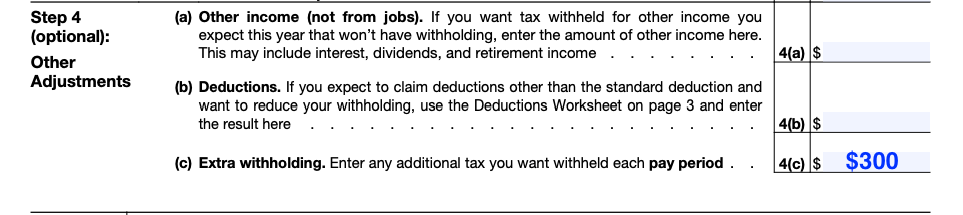 그럼 이제 추가로 withholding하도록 W-4를 수정해보겠습니다. 지금은 이미 4월이 되어서 1/4은 지나갔으니까 $230보다 조금 더해서 2주급마다 $300를 추가로 withholding하도록 수정해볼께요. W-4 양식은 IRS 홈페이지에서 다운받아 보실 수 있습니다.
