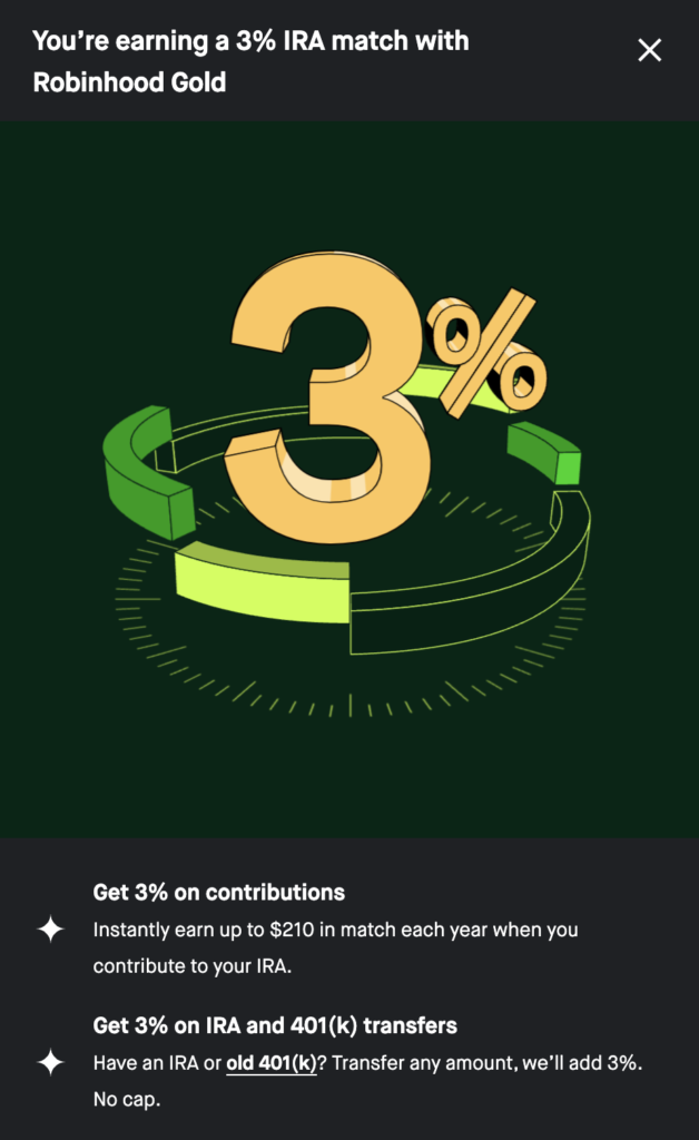 아까 matching에 대해서 소개해 드릴 때도 말씀드렸지만, 이런 matching이란 개념은 대부분 401(k) 플랜에서 회사가 기여해주는 걸 말합니다. 금융서비스 회사에서 IRA matching을 해주는 건 거의 없다고 생각하셔도 됩니다. 지금도 matching을 해주는 IRA는 Robinhood가 유일하고, 게다가 3% matching은 지금까진 없었던 정말 파격적인 조건입니다.