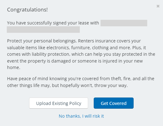 이렇게 세가지 선택 사항이 있는데요. 일단 “No thanks, I will risk it”은 “Renters insurance 가입안하고 그냥 내가 risk를 가지고 갈께” 뜻인데, 아까 Lease Agreement에서도 보셨던 것처럼 Renters insurance는 옵션이 아니라 필수였습니다.